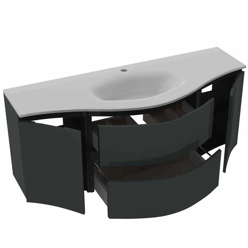 The Calypso Levanto Double Wing Wall Hung Vanity Unit is a premium addition to your bathroom. The wave-fronted design with a classy finish adds elegance. Two side doors and two central drawers provide ample storage space for all of your bathroom essentials. The handleless design gives the drawers a clean and minimalist appearance, while the soft close runners ensure that they open and close softly and silently. The fully expandable drawers make it simple to get to what you need, and the top drawer includes a cut-out for services, making it easy to install