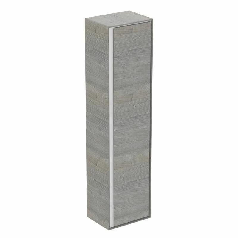 The Ideal Standard Connect Air 400mm Half Column Unit features a wall mounted design with a 1 door edged panel. It is a light grey wood unit with a matt white trim.