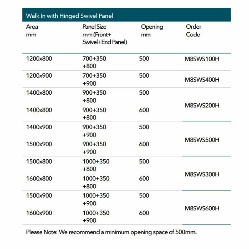 Please note images shown are for illustration purposes only. These are the Walk-in Enclosure, Hinged Swivel Panel and Wall Profiles Only.